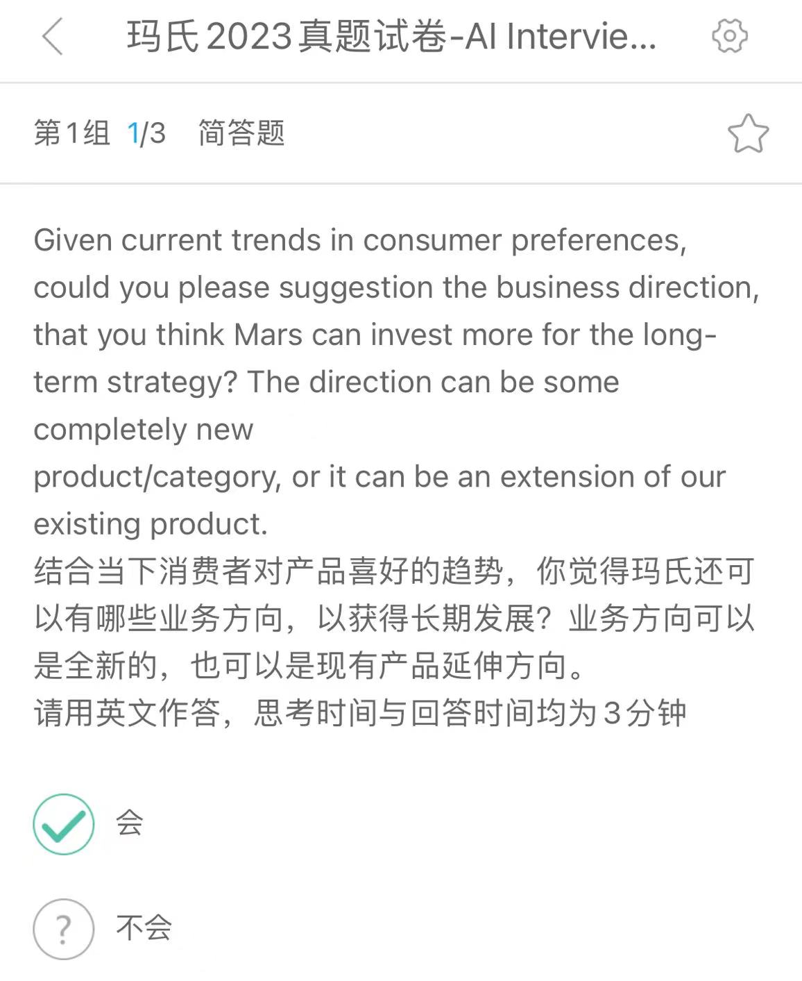 1.历年真题 玛氏2023真题试卷-AI Interview-第一套 玛氏2023真题试卷-AI Interview-第二套 玛氏2023真题试卷-AI Interview-销售和市场 玛氏2022真题试卷-AI Interview第一套 玛氏2022真题试卷-AI Interview第二套 玛氏2022真题试卷-AI Interview第三套 玛氏2021真题试卷-202103-职能管培生 玛氏2021真题试卷与答案解析-202008 玛氏2020AI面试真题 玛氏2020真题试卷与答案解析-201910 玛氏2019真题试卷与答案解析-20181016 玛氏2019真题试卷与答案解析-20181015 2.题目展示