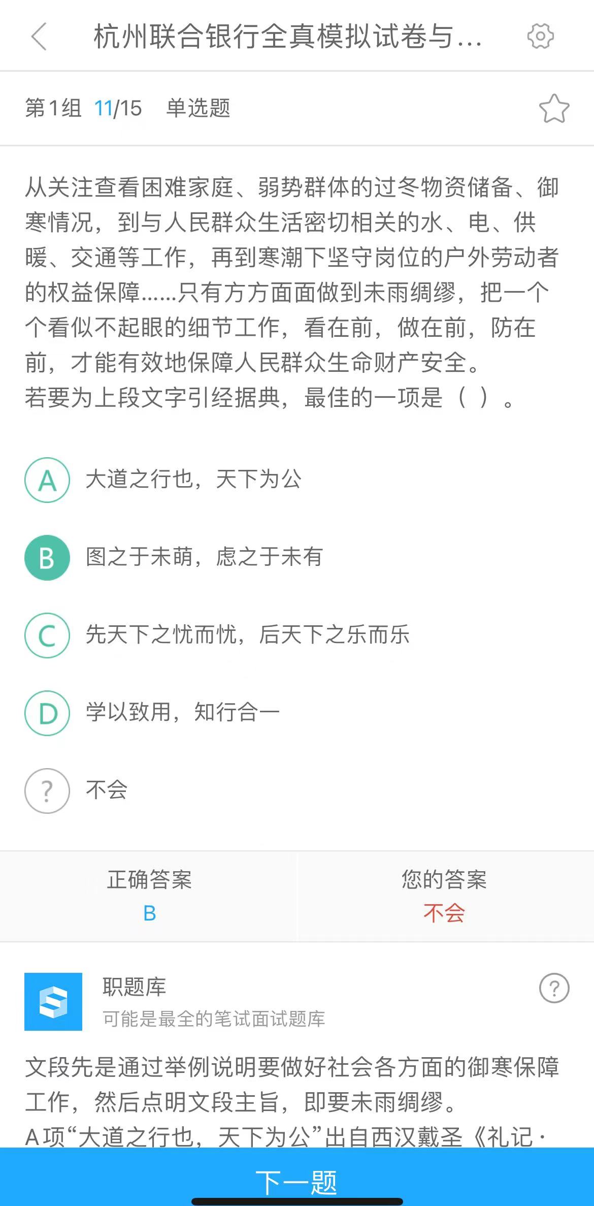 杭州联合银行招聘考试 适用于2026届,持续更新中...... 1.已购对应课程用户赠送题库,可联系客服开通,请勿重复购买! 2.已购题库后再次购买课程的,可联系客服对题库做退费处理! 3.温馨提示:题库有效期为90天,请按时练习! ★题库科目导航:银行—杭州联合银行 | |||